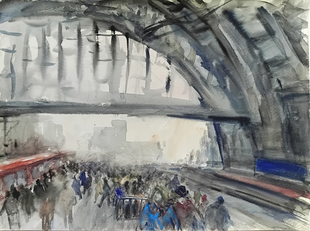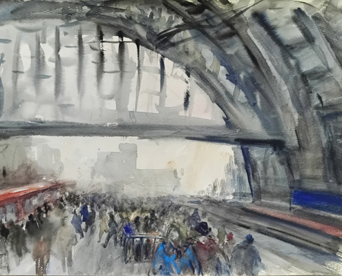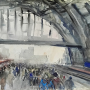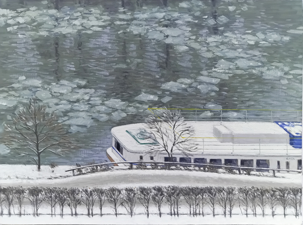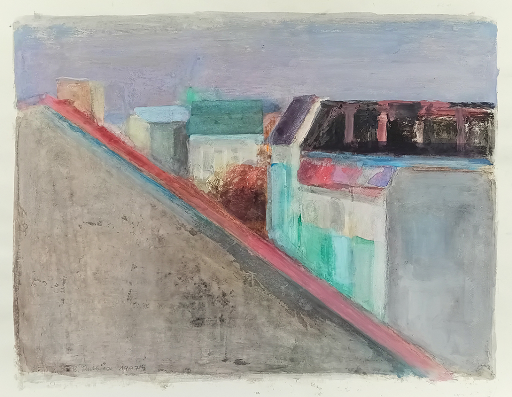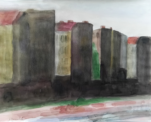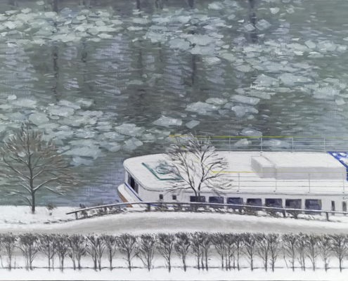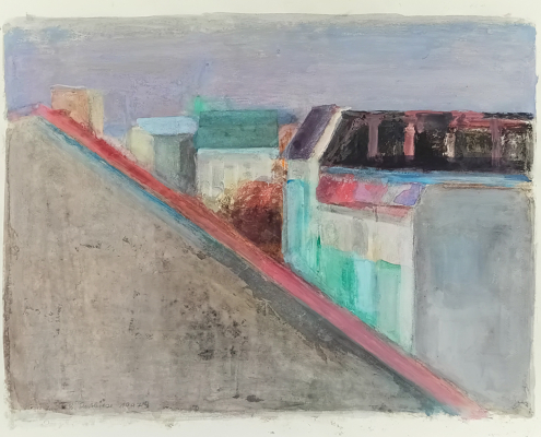 Klaus Jurgeit hielt bis 2017 unscheinbare Berliner Orte mit präziser, fast fotografischer Genauigkeit fest. Seine Aquarelle gelten heute als Zeitzeugnisse und Metaphern urbaner Lebenskraft. Barbara Putbrese, erstmals in der Galerie vertreten, konzentriert sich auf reduzierte, poetische Stadtlandschaften wie Dächeransichten. Ihre Arbeiten zeichnen sich durch sparsamen Farbeinsatz und eine offene, lichtbetonte Bildsprache aus. Hagen Klennert bewegt sich zwischen Ost und West, entwickelte eine eigene reduzierte Formensprache und thematisiert in seinen Arbeiten existenzielle Stimmungen.