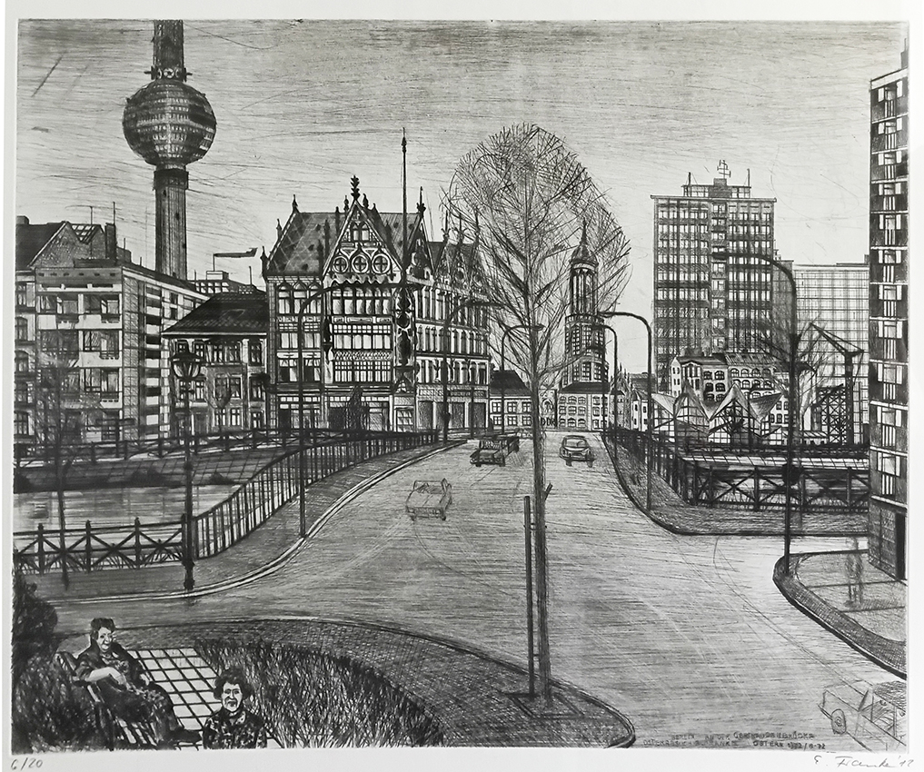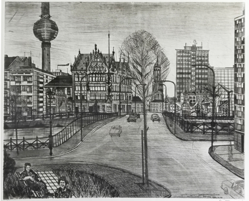 Auch internationale Perspektiven fließen ein, etwa durch Jelisaweta Klutschewskaja, die zwischen Moskau und Berlin arbeitete und urbane Szenen in expressiven Aquarellen festhielt. Eberhard Franke dokumentierte Berlin in detailreichen Radierungen, während Hans-Joachim Billib sich als Vertreter eines individuell erarbeiteten Realismus mit Natur- und Stadtmotiven auseinandersetzte.