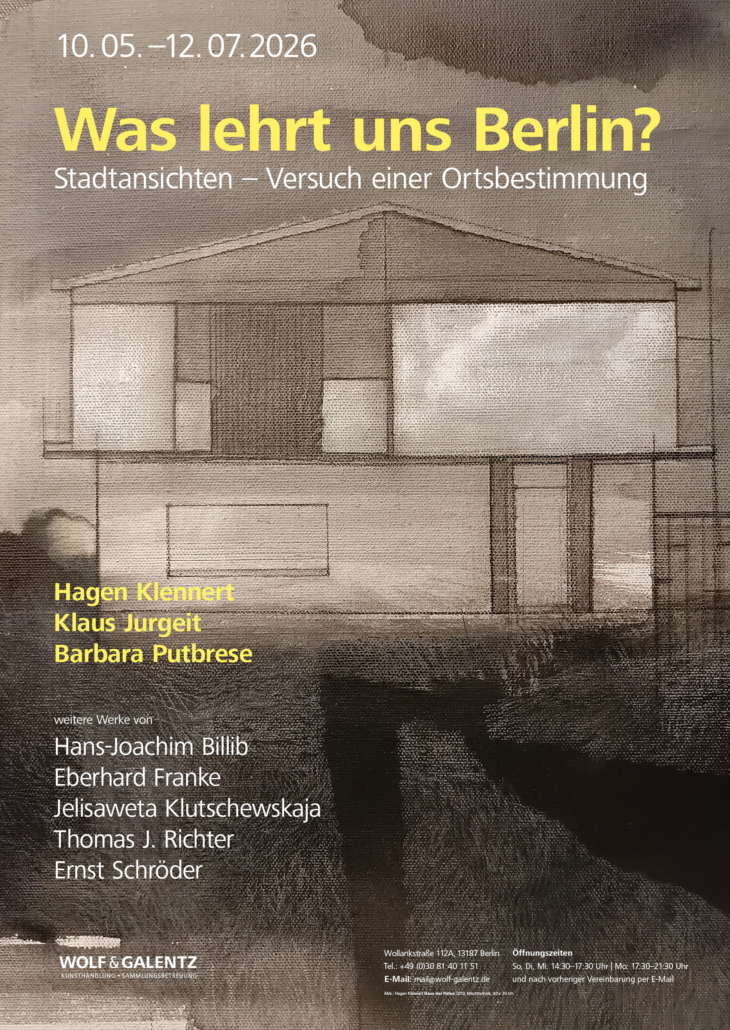 Die 42. Ausstellung der Galerie Wolf & Galentz lädt zu einer Erkundung unter dem Titel „Was lehrt uns Berlin? Stadtansichten – Versuch einer Ortsbestimmung“ ein. Im Zentrum stehen Werke von Hagen Klennert, Barbara Putbrese und Klaus Jurgeit, ergänzt durch weitere Positionen. Die Stadtlandschaft dient als Ausgangspunkt für einen künstlerischen Dialog über Stil, Wahrnehmung und die Frage nach einer spezifischen Berliner Ästhetik – zwischen Ost und West, Vergangenheit und Gegenwart.